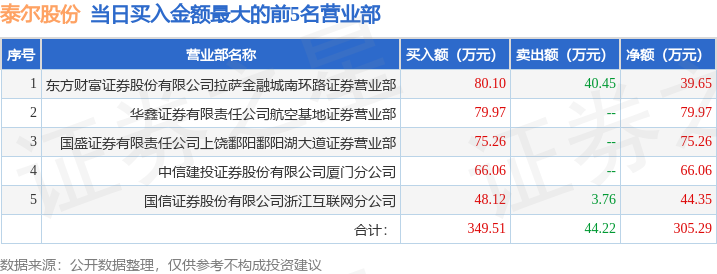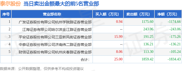 证券之星消息炒股配资,沪深交易所2025年4月2日公布的交易公开信息显示,泰尔股份(002347)因日跌幅偏离值达到7%的前5只证券登上龙虎榜。此次是近5个交易日内第1次上榜。